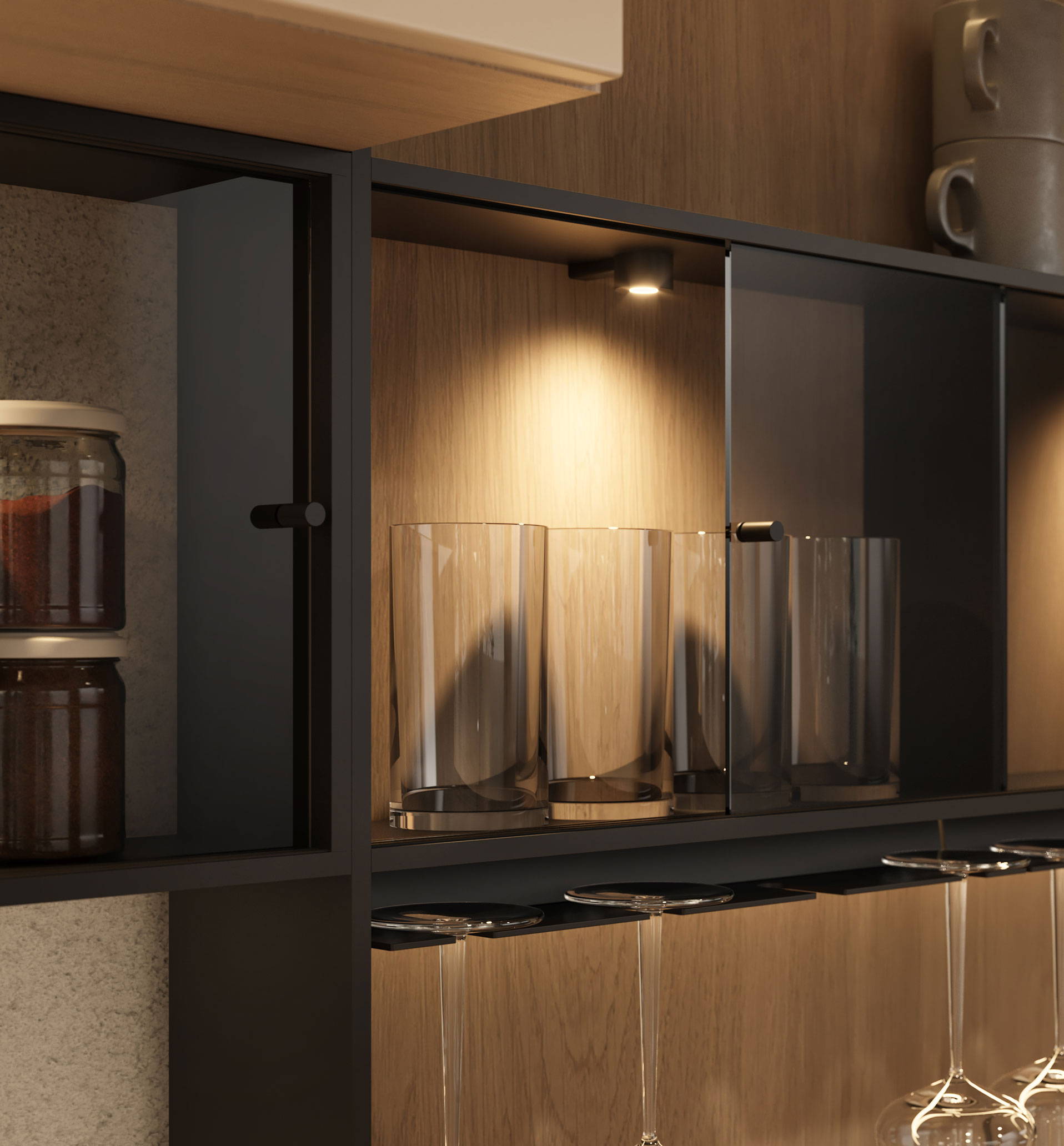 The kitchen racks systems by Damiano Latini, distinguished by an essential and sophisticated concept, are the ideal solution for every size of kitchen, from the smallest to the largest space. These systems, which include accessories such as glasses, paper rolls, plant pots and knives, make everything necessary for preparing meals accessible, maintaining the aesthetics and functionality of the work space.