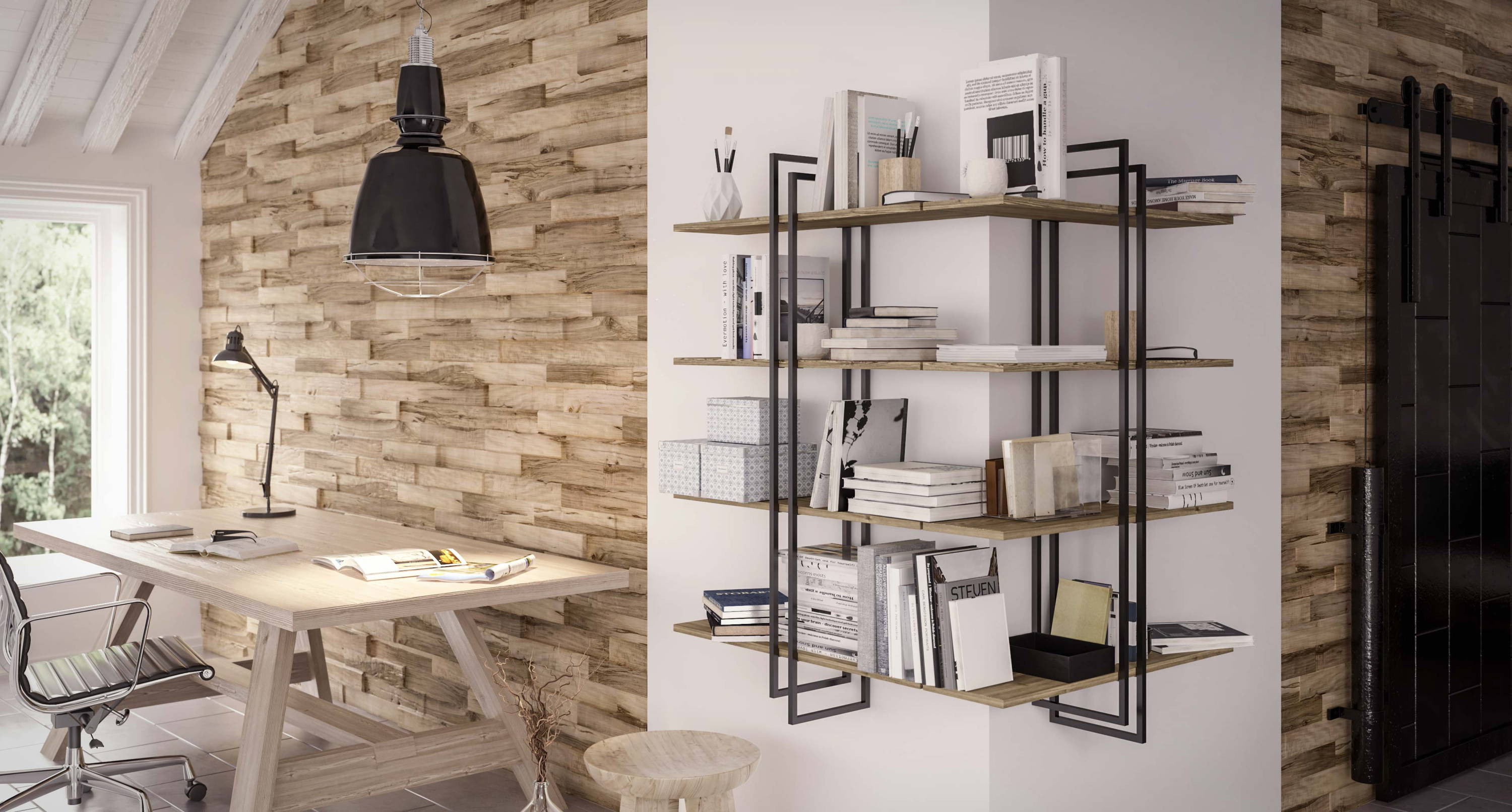PIPE stands out thanks to its industrial design, underlined by the structure made up of wooden shelves and hydraulic pipes. Among the suspended wall bookcases, Damiano Latini also presents TOWER-C and STEP.