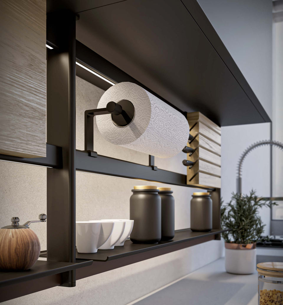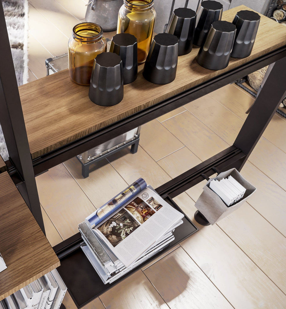 Finally, the ability to disassemble furniture and under-cabinet systems is a key factor in product sustainability, as it allows for separate recycling of each component and reduces shipment volumes, saving space and fuel. A clear example of these best practices is the Hang under-cabinet system, made of aluminum, assembled only with interlocking systems, and produced with profile extrusion processes that avoid excess and minimize waste (which is in any case recycled and reintroduced into production). Lastly, the Hang structure is fully disassemblable, allowing for more compact packaging and more efficient logistics and shipping management.